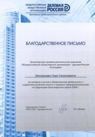 Благодарственное письмо от организации «Деловая Россия» за активное участие в общественной деятельности и содействие в развитие малого и среднего предпринимательства на территории Красноярского края