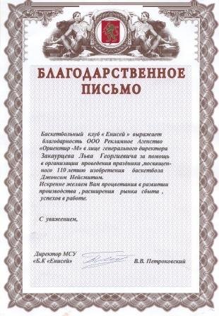 Благодарственное письмо от баскетбольного клуба «Енисей» за помощь в организации проведения праздника, посвященного 110-летию изобретения баскетбола