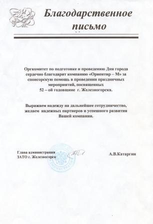 Благодарственное письмо за спонсорскую помощь в проведении 52-ой годовщины г.Железногорска