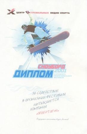 Диплом за содействие в организации фестиваля «Сноуборд-2001»