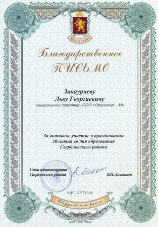 Благодарственное письмо за активное участие в праздновании 30-летия со дня образования Свердловского района