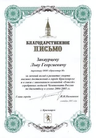 Благодарственное письмо от главы города за личный вклад в развитие спорта в г.Красноярске