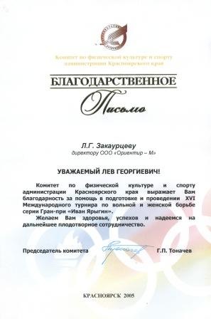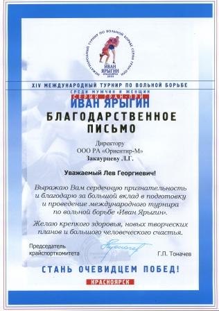 Благодарственное письмо за помощь в подготовке и проведении XVI Международного турнира по вольной и женской борьбе серии Гран-при «Ивана Ярыгина»