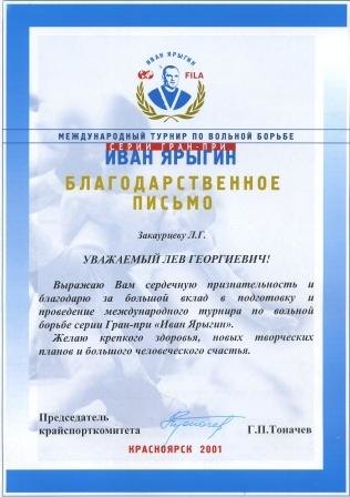 Благодарственное письмо за большой вклад в подготовку и проведение международного турнира по вольной борьбе серии Гран-при «Иван Ярыгин»