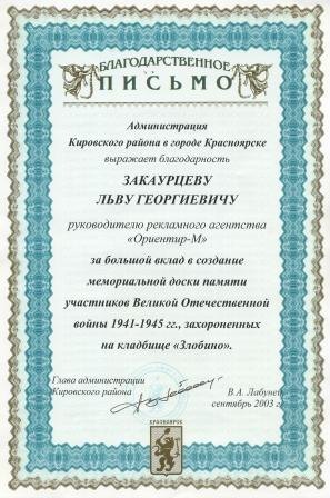 Благодарственное письмо от Администрации Кировского района за большой вклад в создание мемориальной доски памяти участников ВОВ