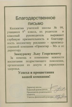 Благодарственное письмо от коллектива учителей школы №99 за помощь и понимание важности воспитания подрастающего поколения
