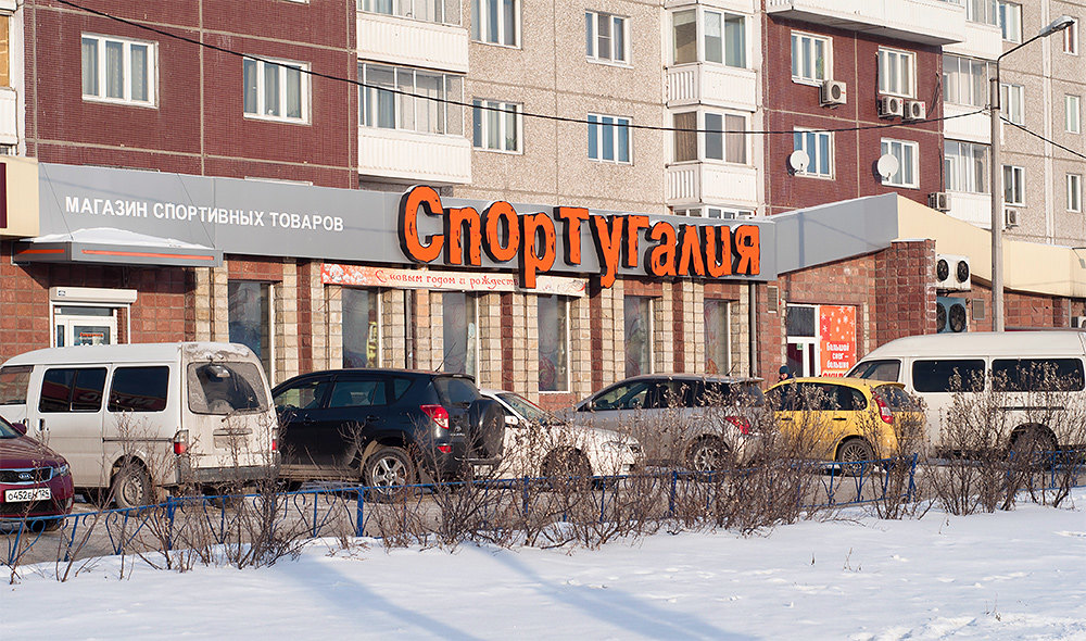 Один из самых известных спортивных магазинов Красноярска «Спортугалия» на Взлетной, 24 провел замену фирменного стиля. В связи с этим произошла замена фасадной вывески.
