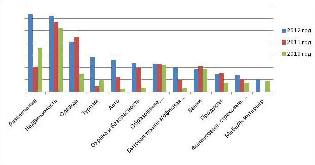 Диаграмма показывает, увеличение компаний, принадлежащих таким отраслям как: сфера развлечений, недвижимость, отрасль одежда, финансы. Это говорит о том, что при оценке коммуникационной политики конкурентов, представители данных отраслей тоже выбирают рекламу на светодиодных экранах, а это подтверждает эффективность данного носителя.