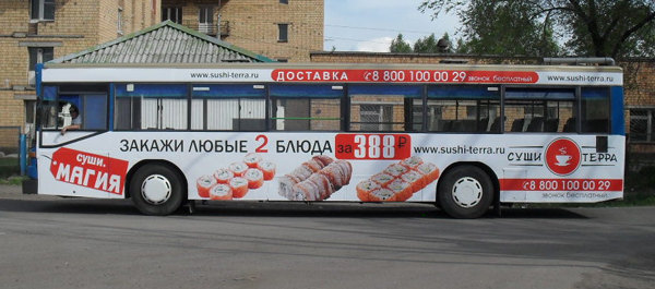 Макет разрабатывался дизайнером компании «Суши Терра», размещение рекламы на транспорте произвела компания