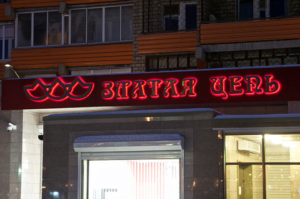 Вывеска изготовлена по новой технологии и в фирменных цветах: буквы выполнены из металла, окрашенного специальной золотой краской. Подсветка осуществляется светодиодами, расположенными внутри букв.
