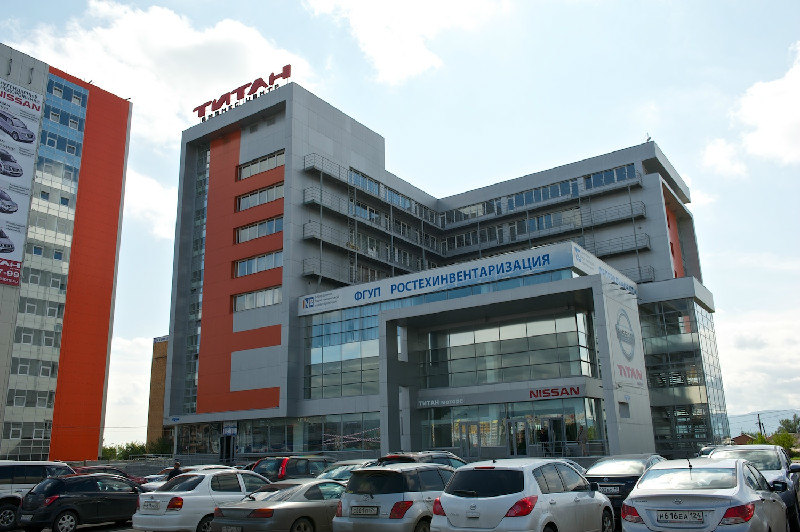 Компанией "Ориентир-М" для Бизнес центра "Титан", находящегося на пересечении улиц Взлетная и Шахтеров, была изготовлена световая крышная установка. Эта одна из первых в городе работ, где на такой высоте для засветки текста использовались светодиоды вместо привычного неона. В словах "Бизнес центр" - диоды белого свечения установлены по контуру букв, а для "Титана" использовалась внутренняя засветка. Вывеска получилась яркой, привлекающей внимание.