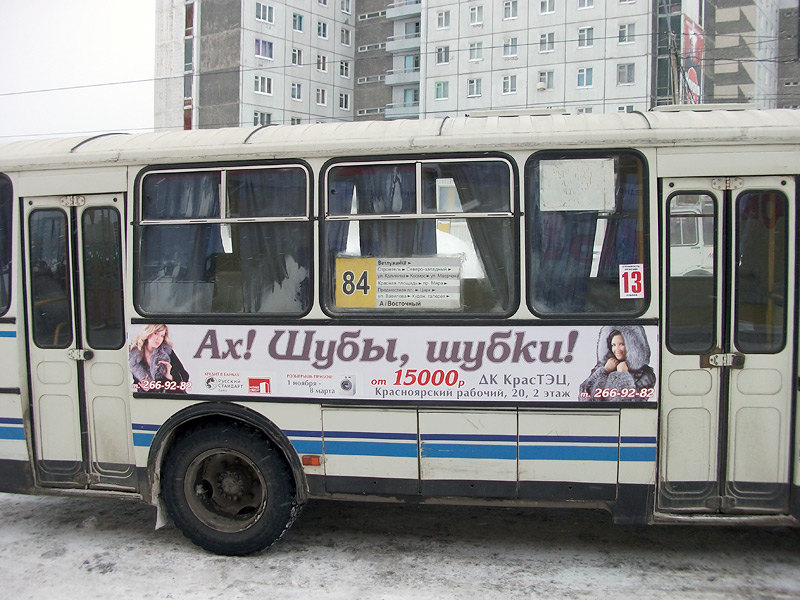 Так, с начала декабря, по городу курсируют 10 автобусов типа ПАЗ с рекламой доступных шубок. Рекламодатель предлагает Красноярцам и гостям нашего города меховую верхнюю одежду с помощью такого рекламного формата как