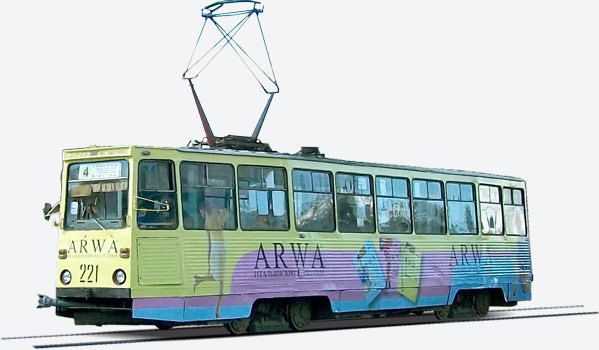 Все больше брендов с мировой известностью выбирают размещение рекламы на электротранспорте. Так, с начала осени на улицах Красноярска появились красочные трамваи с новой рекламой торговой марки итальянских колготок ARWA. Трамваи оформлены в нежных розово-желтых тонах с фотографиями красивых девушек на бортах.