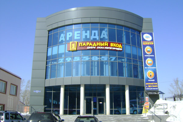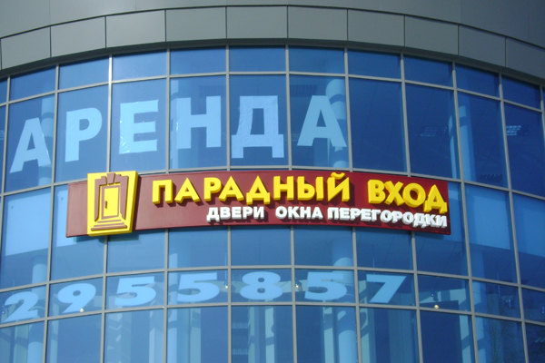 Наша компания изготовила вывеску для салона дверей «Парадный вход» расположенного по улице Красноярский рабочий, 150 И. Вывеска изготовлена по технологии: световые объемные буквы и короб, внутренняя подсветка светодиодами.