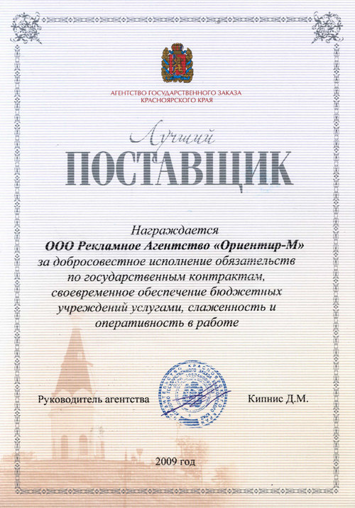 По итогам 2009 года за добросовестное исполнение обязательств по государственным контрактам, своевременное обеспечение бюджетных учреждений услугами, слаженность и оперативность в работе Агентство госзаказа администрации Красноярского края отметило нашу компанию дипломом «Лучшего поставщика».