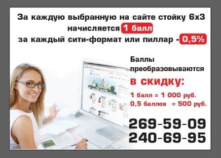 За выбранные на нашем сайте щиты 6х3 или малые форматы (сити-форматы, пилларсы) Вам начисляются баллы, которые можно обменять на дополнительную скидку, помимо той, которая согласована для Вас, если Ваша компания уже является нашим клиентом, или, помимо стандартной скидки 15%, если Вы никогда раньше с нами не сотрудничали.