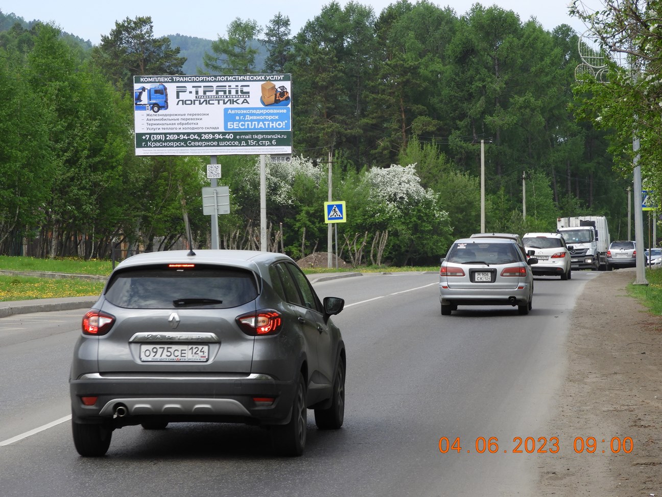 | До поста ГИБДД расположены парк флоры и фауны «Роев Ручей», заповедник «Столбы». Этот район характерен наличием дачного массива. Направление к фан-парку «Бобровый Лог» (парк развлечений).От поста ГИБДД 250 м. | Нет. | Сторона А — направление со стороны г. Дивногорска, Абакана, Ачинска, Балахты в г. Красноярск к улицам Матросова, Крас. рабочему, Предмостной площади. От поста ГИБДД 250 м. | Аэропорт, автовокзал и ж/д вокзал расположены на левом берегу города. | Нет. |