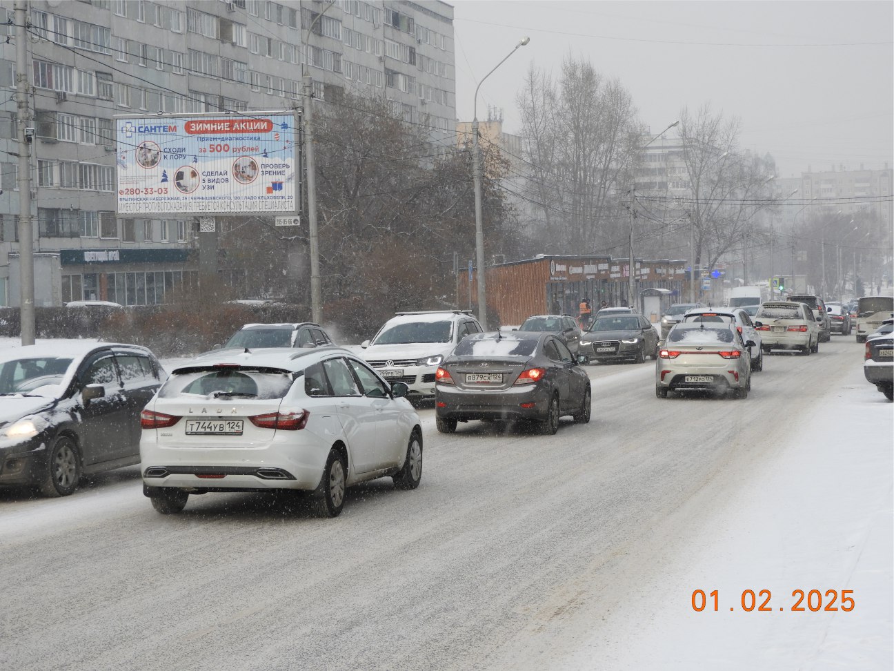 | Рядом находится автоцентр «Медведь», крупный магазин «Компьютеры», агентство недвижимости «Аревера», на противоположной стороне располагаются торговые павильоны и пиццерия «Перцы». | есть | Справа по движению в сторону от пр. Свободный и ул. Новосибирская, по ул. Ладо Кецховели — она одна из крупных улиц Октябрьского района с интенсивным транспортным потоком и большой проходимостью. Рядом находится остановка общественного транспорта. | Автовокзал, ж/д вокзал и аэропорт находятся достаточно далеко от конструкции. | Рядом находится Красноярский Институт Железнодорожного транспорта. |