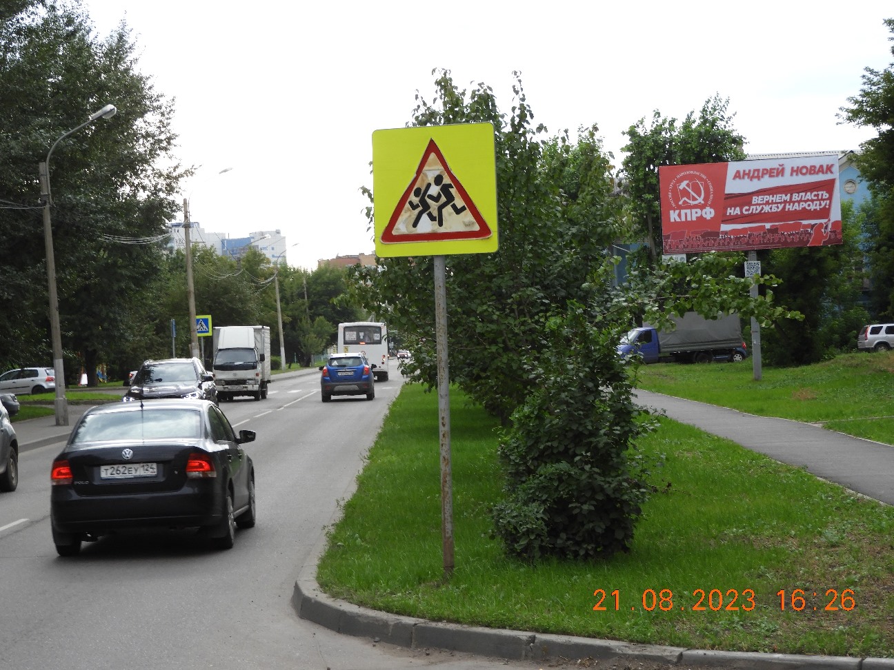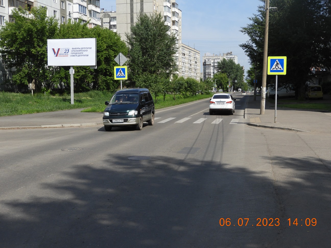 | Конструкция расположена в спальном районе, на перекрестке улиц Новосибирская -Ладо Кецховелли. Рядом расположены жилые дома, продовольственные и хозяйственные магазины, салоны красоты, туристическое агентство и др. | 50 м. | Направление движения сторона А — к улице Киренского и далее к ТК на Свободном. | Авто, ж/д вокзал и аэропорт расположены далеко от конструкции. | Нет. |