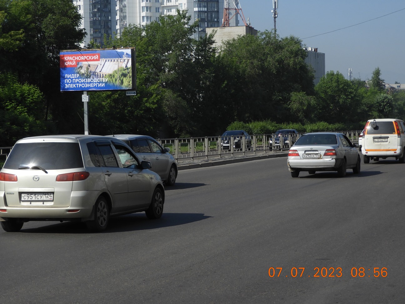 | Рекламная конструкция расположена при выезде с Октябрьского моста при движении по ул. Крайняя, охватывая поток с ул. Мичурина, в сторону оживленного перекрестка ул. Чайковского-пр. им. газеты «Красноярский рабочий». Рядом с конструкцией расположены: ОАО «Сбербанк России», ОАО «Ростелеком», сеть магазинов «Дом Куприяна», сеть магазинов «Эльсити», сеть гастрономов «Красный Яр», фабрика-химчистка «Мистер Чисто», автомаркет «Крепость», зоомагазины, салоны красоты и т. д. | есть пешеходный переход 60 метров | Направление движения: сторона А -при движении с Октябрьского моста, по ул. Крайняя в сторону пр. им. газеты «Красноярский рабочий». | Автовокзал «Восточный» находится примерно в 30 мин. езды. | Отсутствуют |