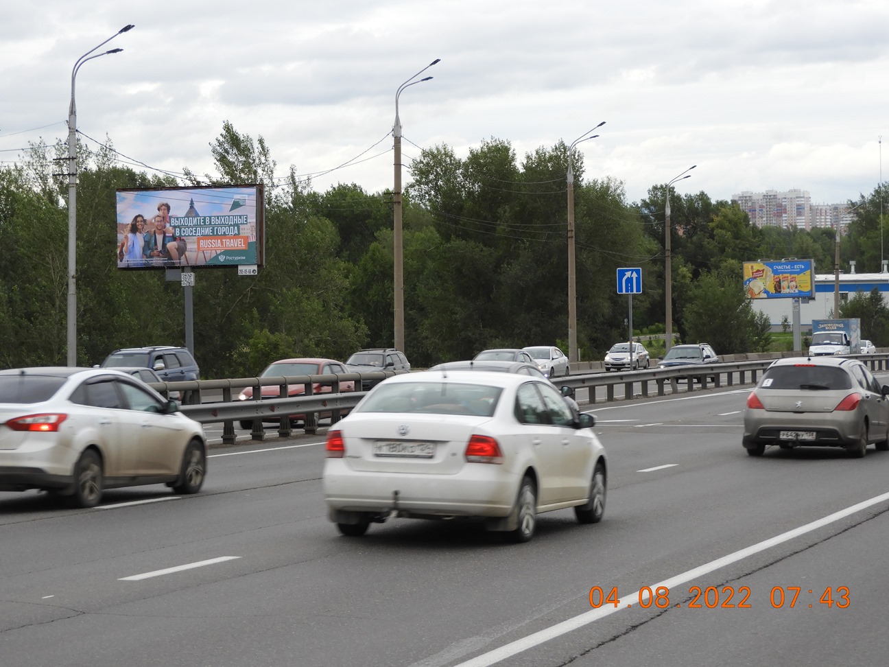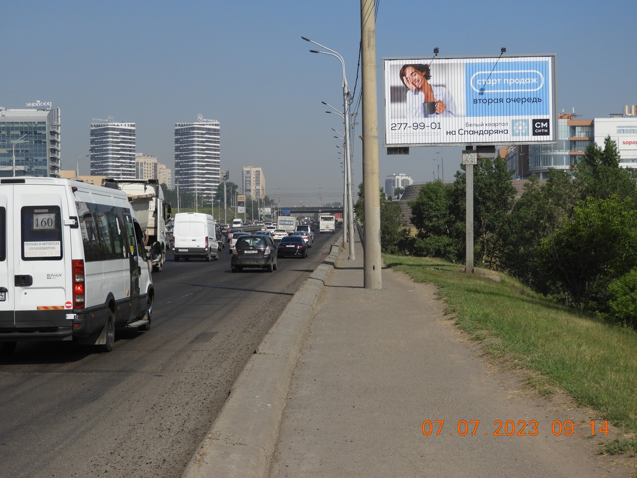 | Рекламная конструкция расположена на Октябрьском мосту при движении с правого на левый берег города, транспортная магистраль, соединяющая Кировский, Ленинский и Советский районы города. Рядом с конструкцией расположены: ТРЦ «Июнь», гипермаркет «Окей», сеть магазинов косметики и парфюмерии «Л Этуаль», кинотеатр «More Cinima» и т. д. | Отсутствует | Направление движения: сторона А — охватывает поток движения с пр. им. газеты «Красноярский рабочий» — пер. Сибирский — ул. Мичурина — ул. Крайняя. | Автовокзал находится примерно в 25 мин. езды. | Отсутствуют |