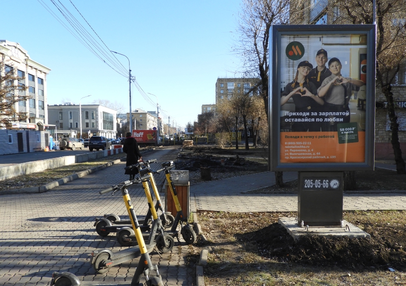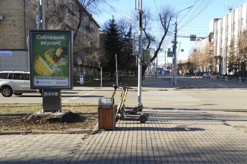 | Конструкция расположена в центре города, рядом с конструкцией расположены: ОАО «Азиатско-Тихоокеанский» банк, сеть салонов оптики «Давыдов», много различных бутиков одежды и обуви, ЦУМ, ювелирные магазины, агентство недвижимости. Так же рядом находится супермаркет «Красный Яр», крупный кинотеатр «Луч», салоны сотовой связи, банкоматы. | - | Конструкция расположена по ул. Карла -Маркса движение одностороннее. | Автовокзал, ж/д вокзал находятся примерно в 30 минутах езды от конструкции. | Рядом расположен корпус Педагогического университета, Красноярский Дом Учителя. |