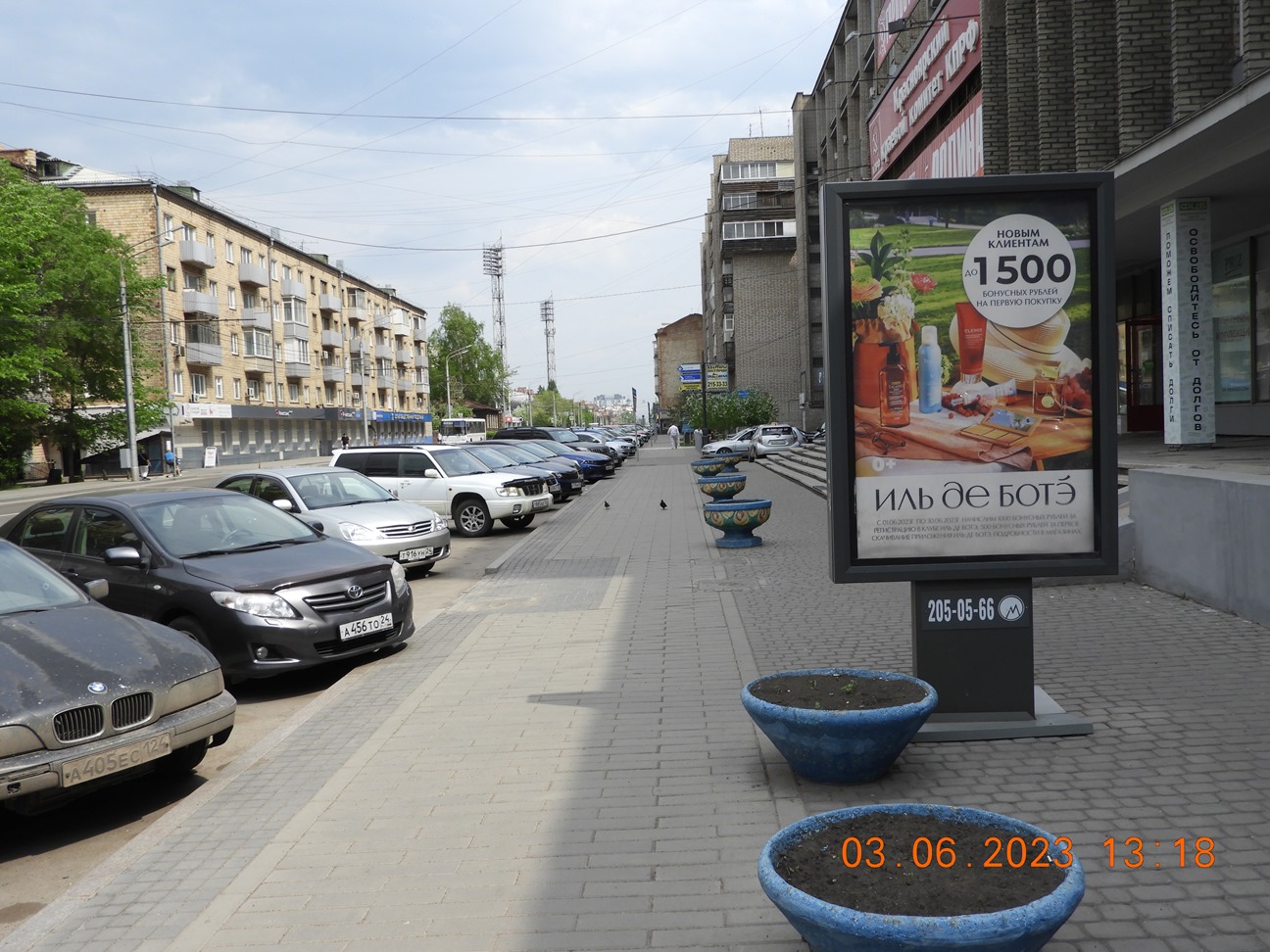 | Конструкция расположена в центре города. Рядом с рекламной конструкцией расоложен ТД «Комфорт», Бизнез-центр, ЗАО Банк «Интеза», ОАО АКБ «Российский капитал» и др. Так же рядом расположен офис туристической компании «My Holiday», «Банк Российских туров», кофейня P,tit Moment, Кафе-бар «Mike and Molly» и др. | нет | Конструкция расположена на очень оживленном участке дороги. Направление движения в сторону ж/д вокзала. Центр города. | Ж/д вокзал находится в 15 минутах езды. | - |