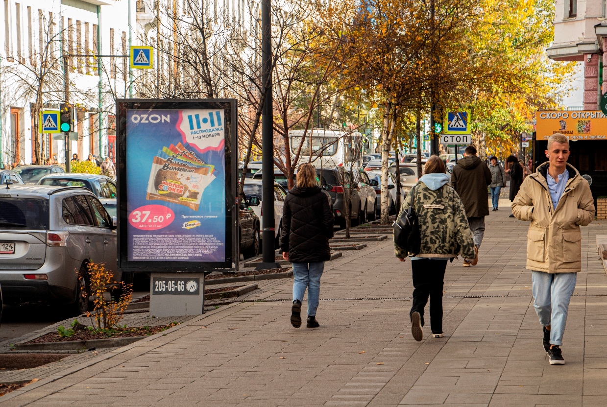 | Конструкция расположена в центре города, поэтому рядом очень много различных магазинов, таких как «Alba», «Ecco», ТЦ «Проспект», ювелирные магазины такие как: «Адамас», «585», «UnZo», ОАО КБ «Кедр». Так же много всевозможных кофеен «Greenhouse», «Traveler,s Coffee», «Брауни», «Shanti bar», туристические компании, салоны красоты и др. | есть, 50 метров | Конструкция расположена возле перекрестка ул. Мира — Диктатуры Пролетариата. Направление движения: сторона А — в сторону ул. Кирова, Детский Мир. | Ж/д вокзал находится в 20 мин. от конструкции. | - |