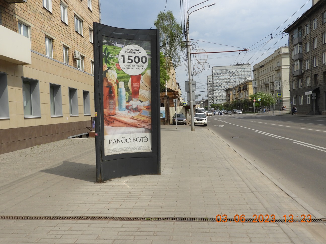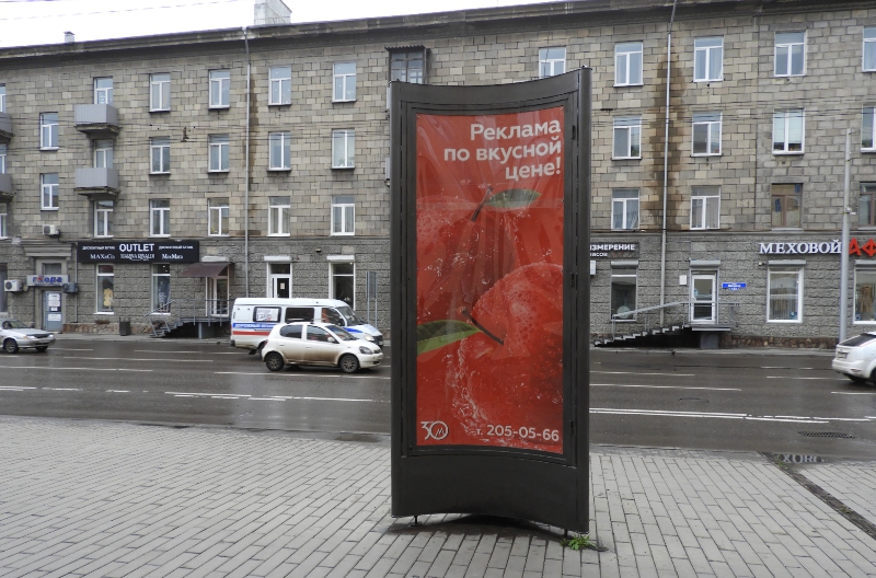 | Рекламная конструкция расположена на одной из оживленных улиц Железнодорожного района, рядом с конструкцией находится: магазин одежды «La Maison», «Fetish», «Outlet», салон часов «Четвертое измерение», супермаркет «Красный яр» и многое другое. | есть, 50 метров | Конструкция расположена на тротуаре. Сторона А — движение в сторону Ж/д вокзала, движение одностороннее. | Железнодорожный вокзал находится в 10 минутах езды. | - |